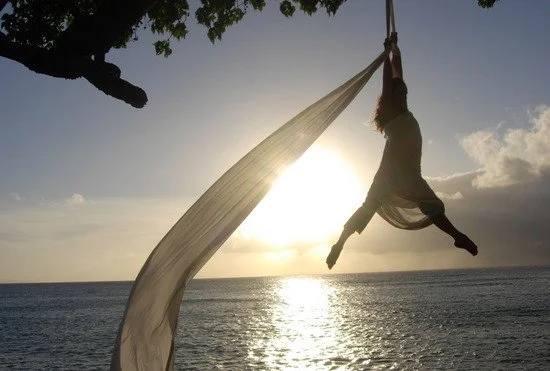 A wonderful journey. Pretty much after learning basic aerial skills, I adapted and made them my own style. I wasn’t strong like a gymnast or an Olympic athlete, so I had to be creative with what I could do. Nowadays I’m a bit stronger, but it has been a long journey. From inside the theatre I took Aerials outside, hanging from the most beautiful trees and at incredible locations in Hawai’i. Can’t beat that feeling of union with nature. A wonderful journey and to also see the arts expanding here – I feel complete, kinda Samadhi state :)